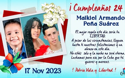 Familias, cubanas y cubanos, Este 17 de noviembre está cumpliendo 24 años Maikiel Armando Peña Suárez, preso político, encarcelado por ejercer su derecho cívico participando en las históricas protestas populares del 11 de julio del 2021 en su pueblo natal, Vegas, provincia Mayabeque. Fue allí, como en las más de sesenta localidades de Cuba, el […]