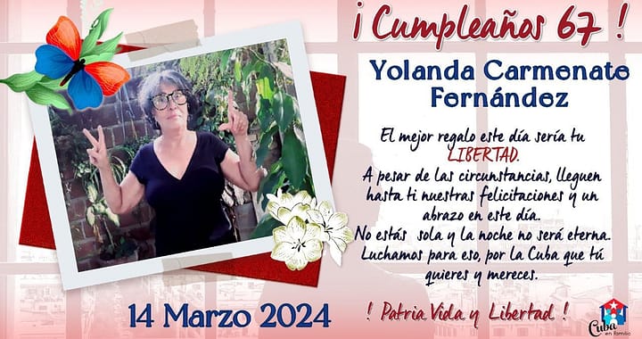Hoy 14 de marzo de 2024 está cumpliendo 67 años una valerosa cubana, la tunera Yolanda Carmenate Fernández, activista de la Unión Patriótica de Cuba (UNPACU), ex presa política que permanece injustamente en prisión domiciliaria.